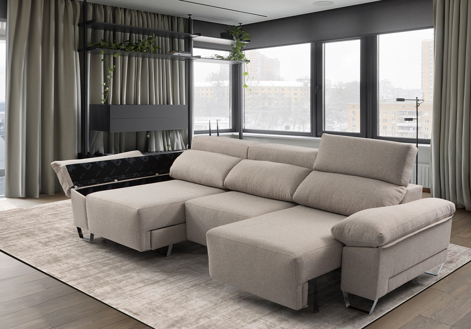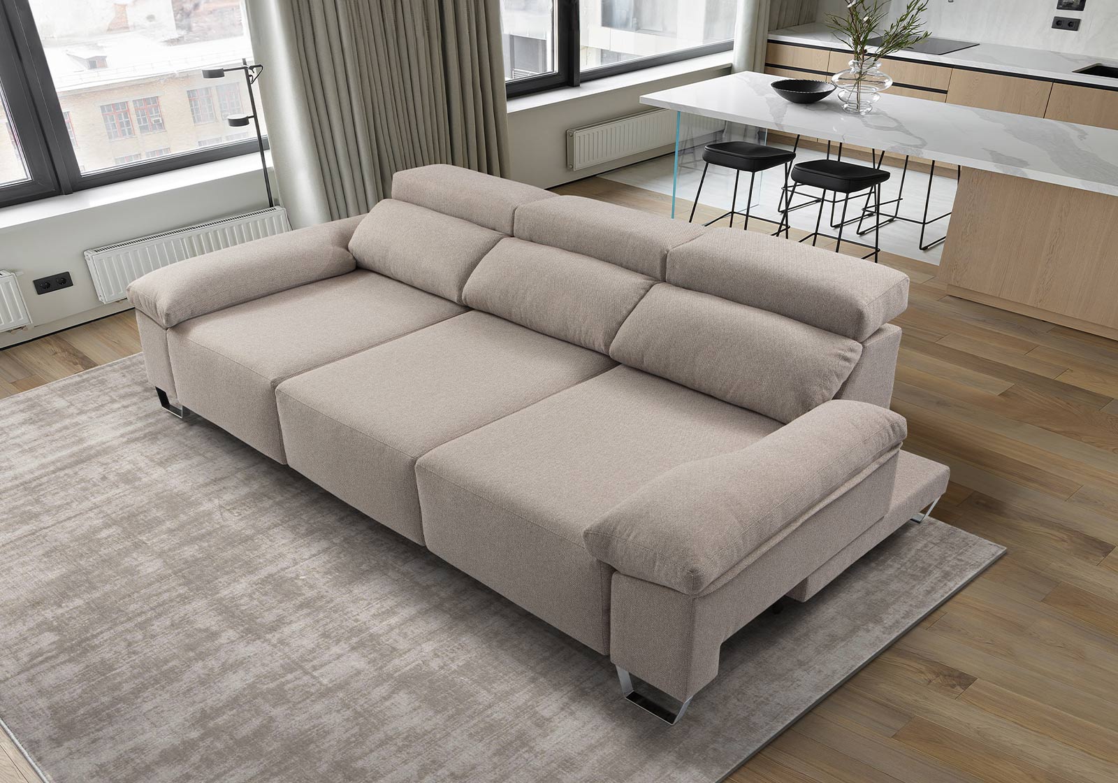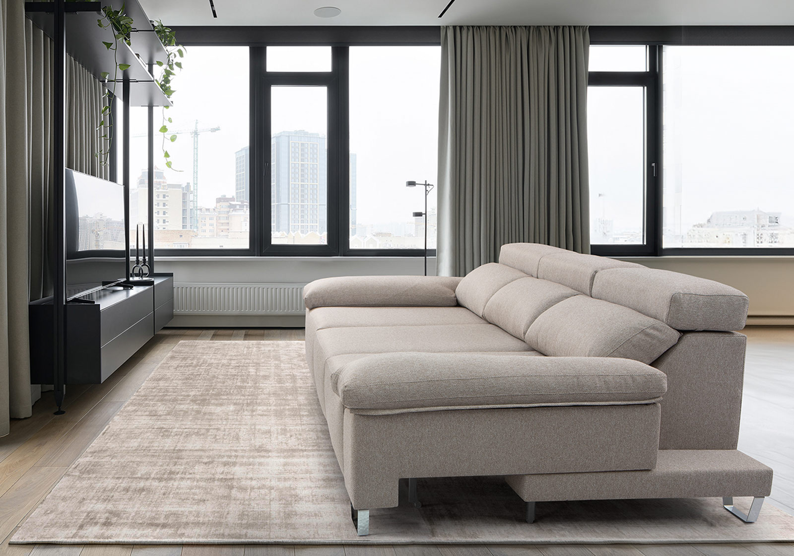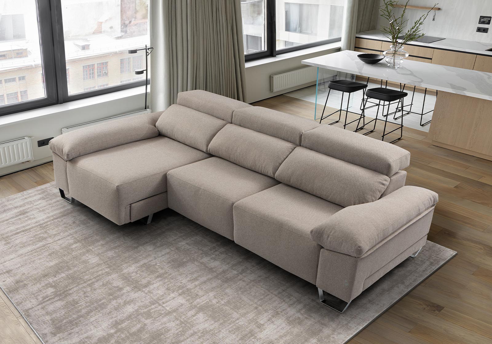 Colección de sofás muy versátil y adaptable con sistema deslizante manual en el suelo y pies metálicos.
