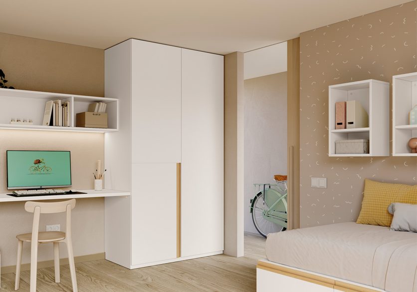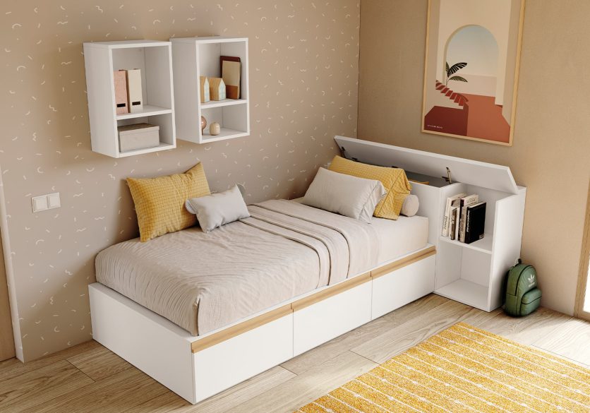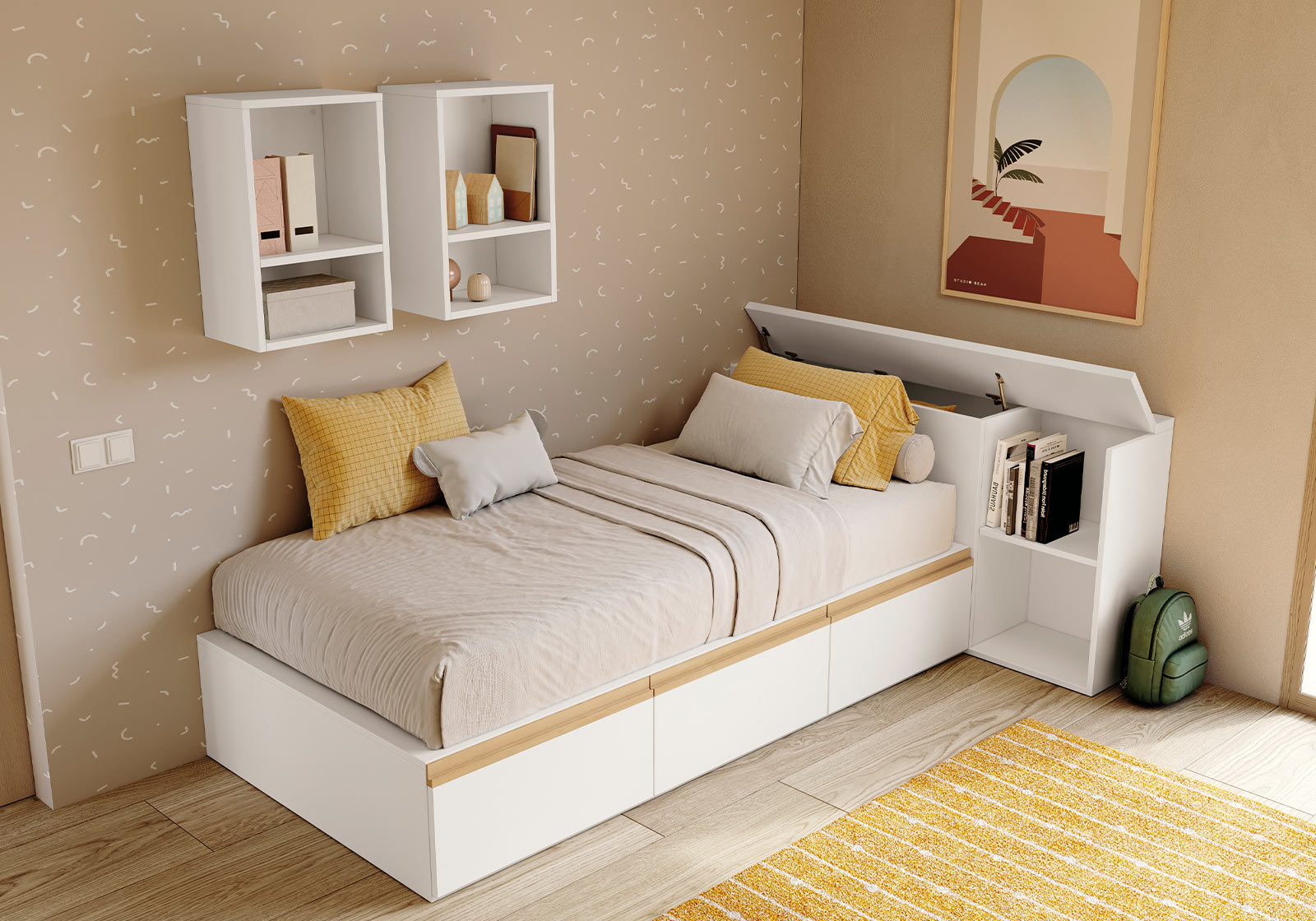 Dormitori compost per un llit individual per matalàs de 90×190 cm, amb calaixos inferiors i capçal amb arcó.