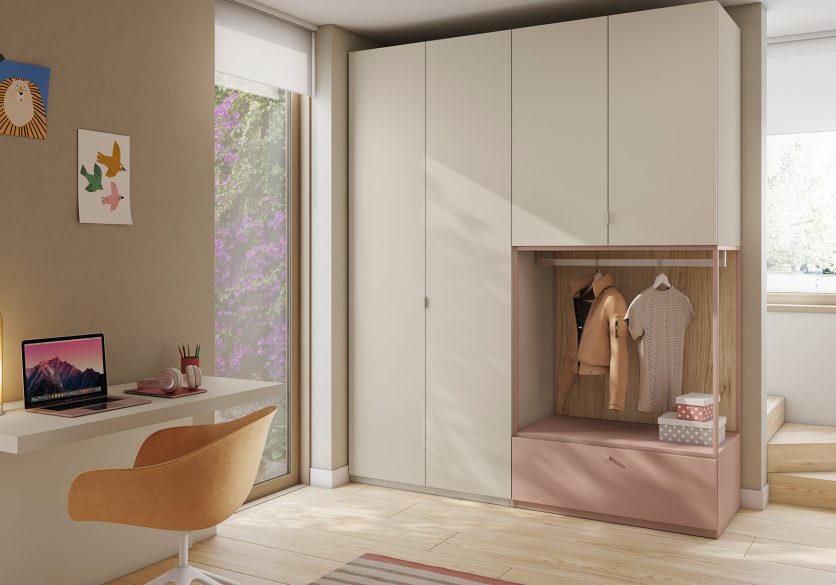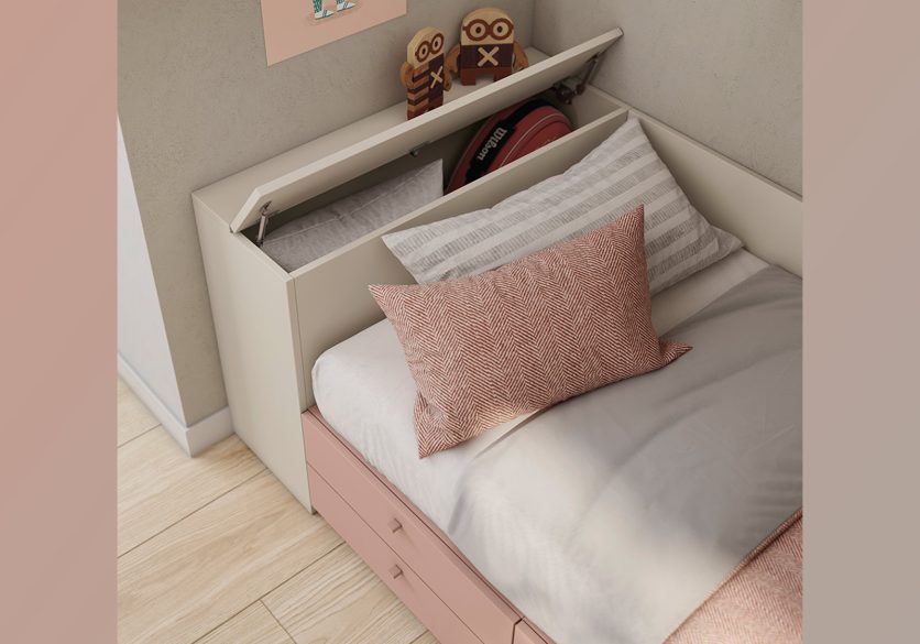 Dormitori compost per un llit individual per matalàs de 90×190 cm, amb calaixos inferiors i capçal amb arcó.