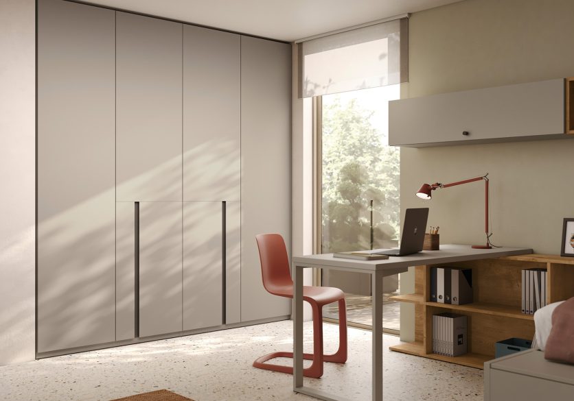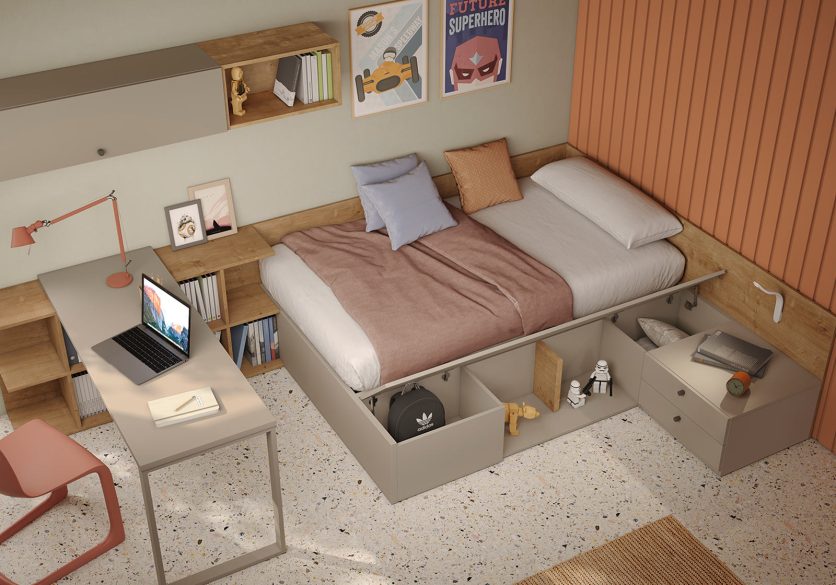 Dormitori compost per un llit individual per matalàs de 90×190 cm, amb canapè lateral i mòdul de calaixos. Inclou panells laterals.